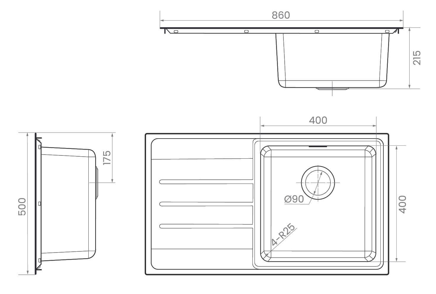 Single Bowl and RH Drainer 860 x 500 with 400 x 400 / 215 deep